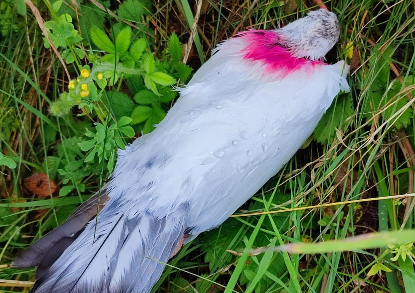 The spot where the poison was applied is clearly visible on the pigeon's neck. Here is a dead breeding pigeon in Regensburg. “Kamikaze pigeons” are also used in Germany.