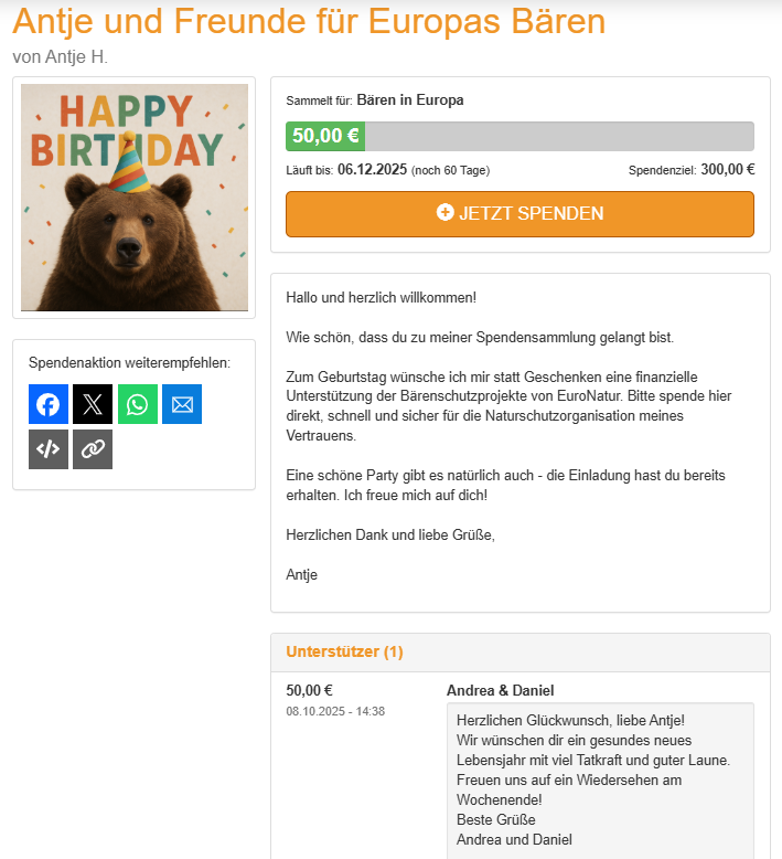 In wenigen Minuten können Sie hier Ihre eigene Spendenseite erstellen und Ihre Gäste bitten, für den Erhalt wilder Flüsse, alter Wälder oder bedrohter Tierarten zu spenden. So setzen Sie gemeinsam mit Familie und Freunden ein starkes Zeichen für Europas Natur.