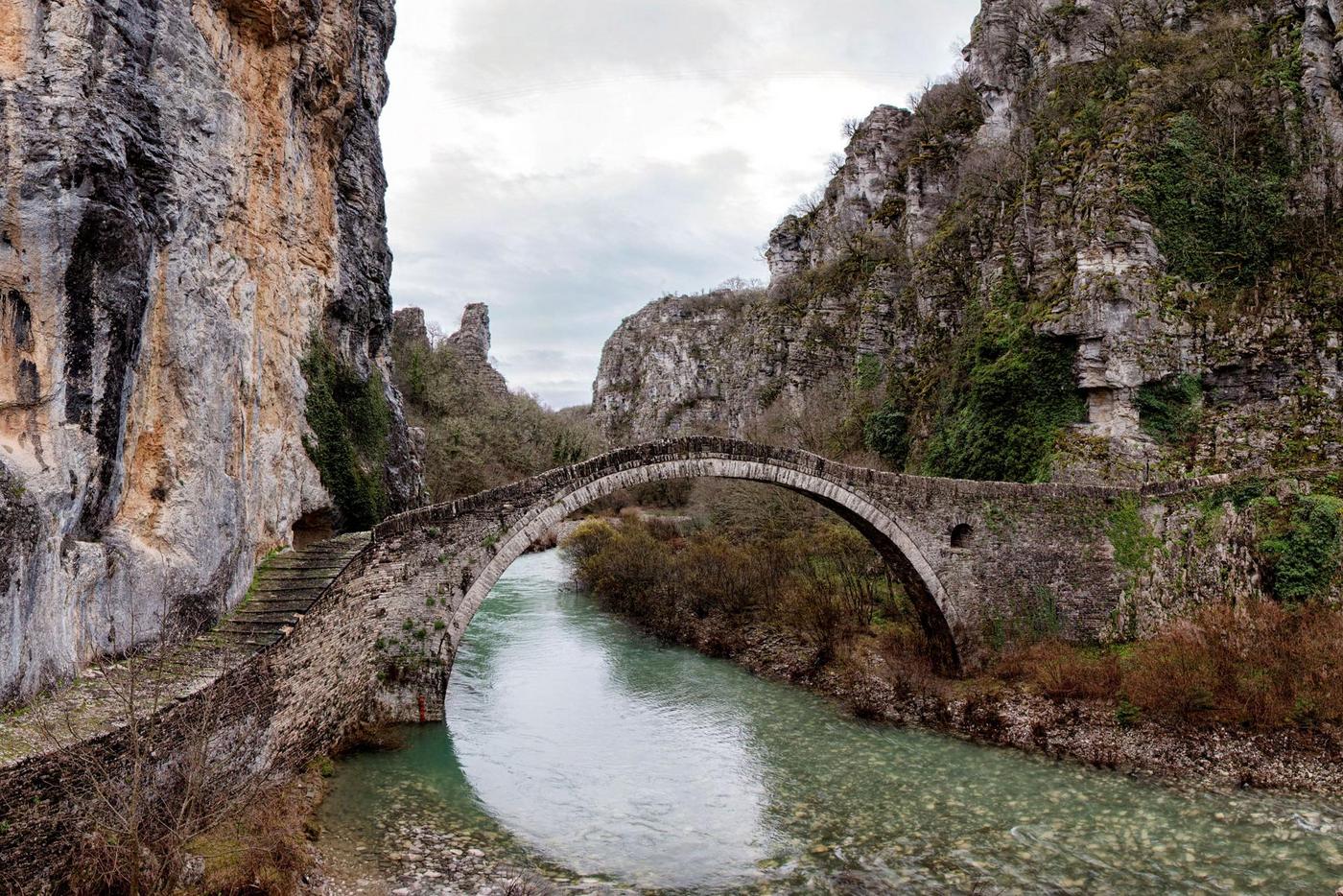 Natur prägt Kultur: Historische Einbogenbrücke über den Fluss Voidomatis, ein Zufluss des Aoos.