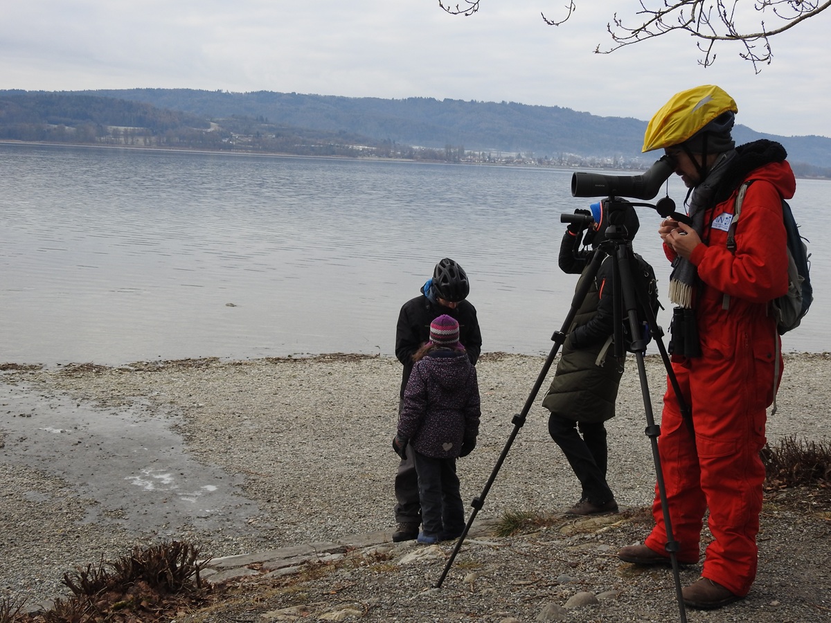 Vögel zählen macht Spaß, allzumal in Gesellschaft und wenn es für einen guten Zweck ist. Hier Freiwillige von EuroNatur bei der Wasservogelzählung am Bodensee am 12. Januar 2025.