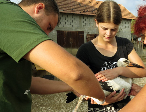 Einer der jungen Störche wird in Bosnien-Herzegowina beringt. Inzwischen ist er auf Malta gelandet. Auch dort ist die Gefahr groß, von Wilderern erschossen zu werden.